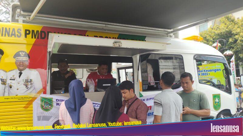 Tampak mobil pelayanan keliling Disdukcapil Rohil di kerumuni masyarakat untuk mendapatkan layanan IKD. Petugas Disdukcapil yakni Administrator Data Base Darsono dan Firdaus serta petugas lainnya juga dengan begitu ramah dan sigap melayani warga baik yang melakukan aktivasi maupun yang sekedar ingin bertanya.