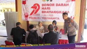 YOGYAKARTA | LENSANUSA.COM. – Memperingati Hari Bhayangkara ke-79, Polda DIY menggelar kegiatan bakti kesehatan berupa donor darah di Gedung Promoter Polda DIY, Selasa (17/6/2025).