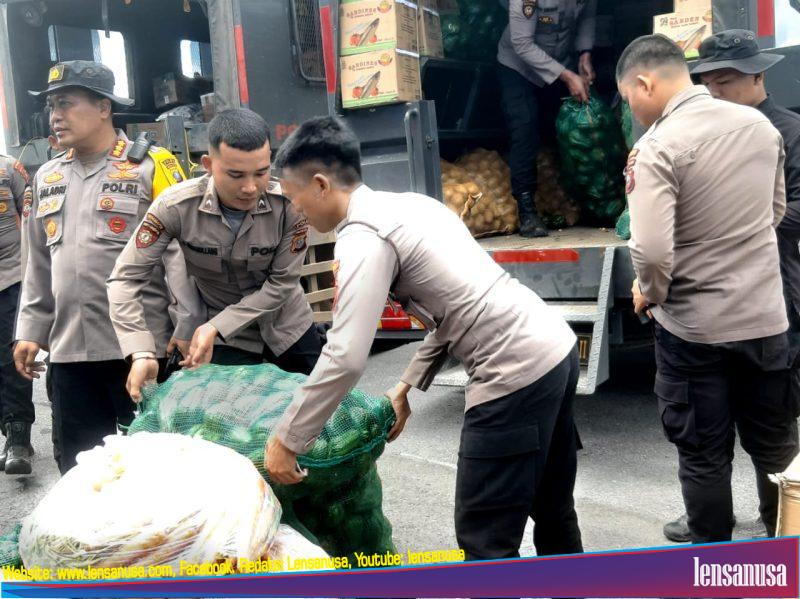 Bantuan terdiri dari Wortel 240 kg, Kentang 180 kg, Cabe merah 180 kg, Tomat 300 kg, Sawi putih 300 kg, Jipang 360 kg, Sarden kaleng 75 dus, Jahe merah 6 karung, Garam 60 bal, Bawang merah 6 karung, Bawang putih 6 karung, Beras 2 goni, Telur 2 papan, Mie instan 4 kotak.