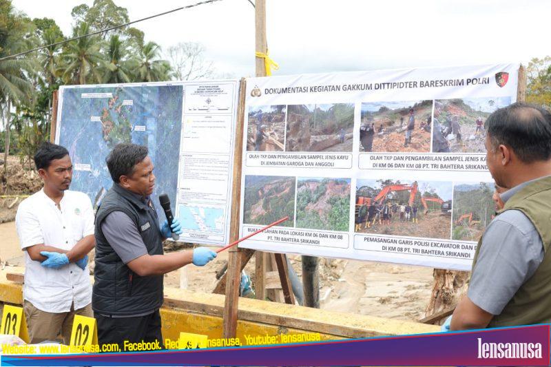 Saat memimpin proses pemeriksaan di lokasi, Dirtipiter Bareskrim Polri, Brigjen Pol. Moh. Irhamni, S.I.K., M.H., menjelaskan bahwa kayu-kayu yang tersangkut di dua jembatan utama telah menutup aliran sungai sehingga menimbulkan luapan air besar yang menghantam pemukiman warga.