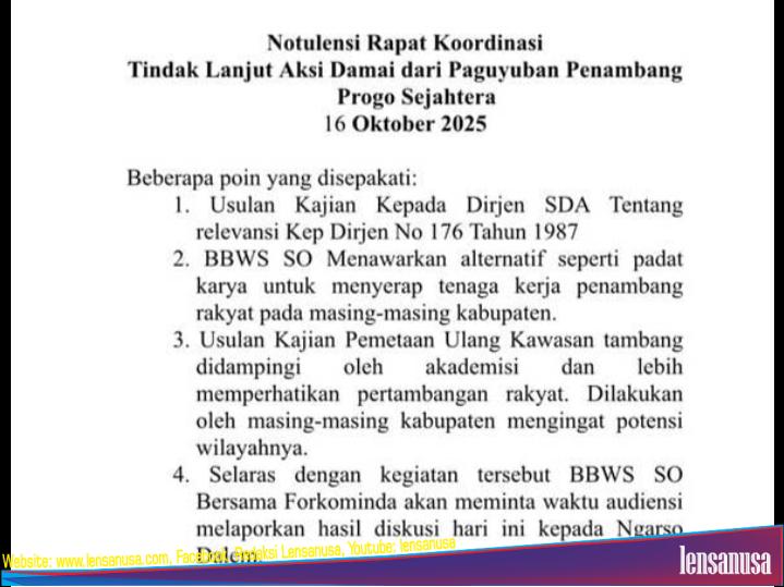 SLEMAN | LENSANUSA.COM. – Setelah aksi unjuk rasa para penambang rakyat sungai Progo yang tergabung dalam Paguyuban Penambang Progo Sejahtera (PPPS) di Kantor Balai Besar Wilayah Sungai Serayu Opak (BBWSSO) Janti, Sleman, pada Kamis (16/10), pihak BBWSSO akhirnya melakukan rapat koordinasi dengan sejumlah instansi terkait serta sejumlah APH dan Kepala Daerah. Namun, hasil koordinasi tersebut dinilai tidak berpihak kepada penambang.