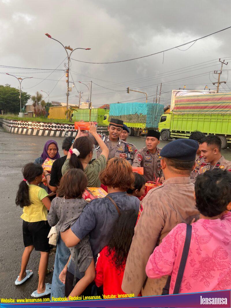 Brimob Batalyon B pelopor membagikan takjil yang diborong dari pedagang di sekitaran Tugu Pepadun kemudian di bagikan kepada masyarakat, Jum’at (29/3/2024).