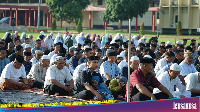 MEDAN | LENSANUSA.COM — Suasana khidmat dan penuh kebersamaan mewarnai pelaksanaan Shalat Idul Adha 1446 H yang digelar di Lapangan Hijau Ksatriaan K.E Lumi, Markas Komando Satuan Brimob Polda Sumatera Utara, Jumat pagi (06/06/2025). Ribuan jamaah dari kalangan masyarakat sekitar, personel Brimob, Bhayangkari, serta anak-anak memenuhi lapangan yang terletak di Jl. Bhayangkara No.293, Kelurahan Indra Kasih, Kecamatan Medan Tembung, Kota Medan.