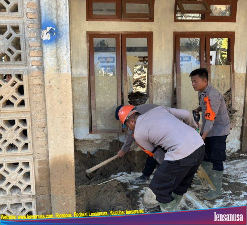 Personel Brimob turun ke lokasi-lokasi yang terendam lumpur, membantu membersihkan masjid dan rumah-rumah warga.