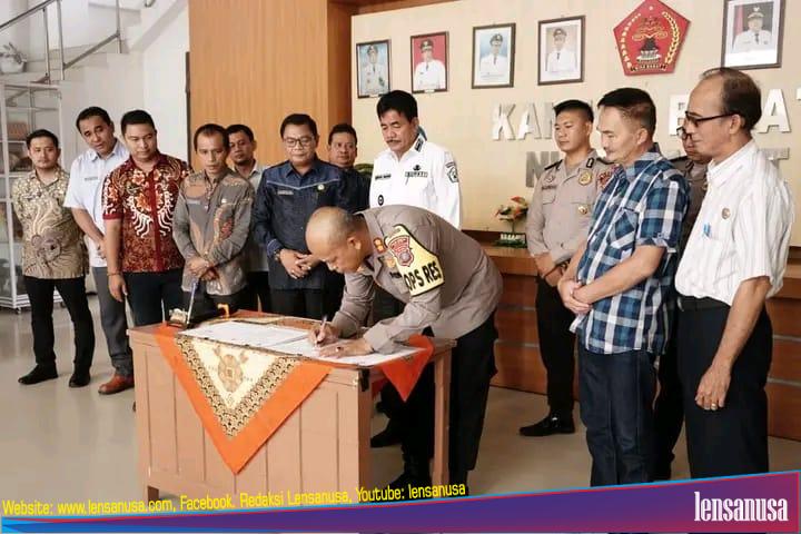 Acara serah terima lahan, diawali penanda tanganan naskah hibah Daerah antara Pemerintah Kabupaten Nias Barat dengan Polres Nias.