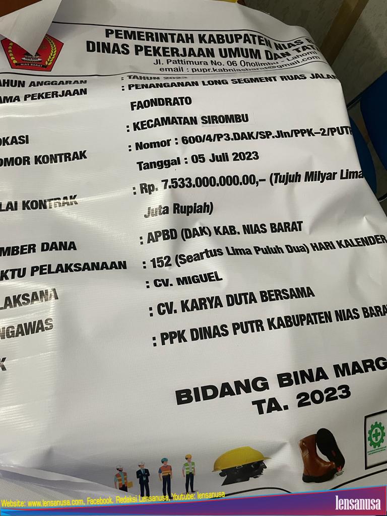selaku Konsultan Pengawas. Proyek Pembangunan Penanganan Long Segment Faondrato itu Nomor Kontrak 600/4/P3/DAK/SP.jln/PPK-2/PUTR/NISBAR dengan nilai sebesar Rp 7.533.000.000,00 (tujuh milyar lima ratus tiga puluh tiga Juta Rupiah) bersumber dari DAK APBD Nias Barat.
