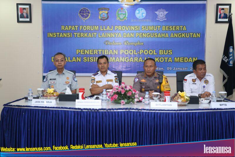 MEDAN | LENSANUSA.COM – Direktorat (Dit) Lalu Lintas Polda Sumut rapat bersama Forum Lalu Lintas Angkutan Jalan (LLAJ) Sumut dalam pengoptimalan Terminal Terpadu Amplas bertempat di Kantor PT Jasa Raharja Cabang Sumut, Jalan Gatot Subroto, Medan, Selasa (9/1).