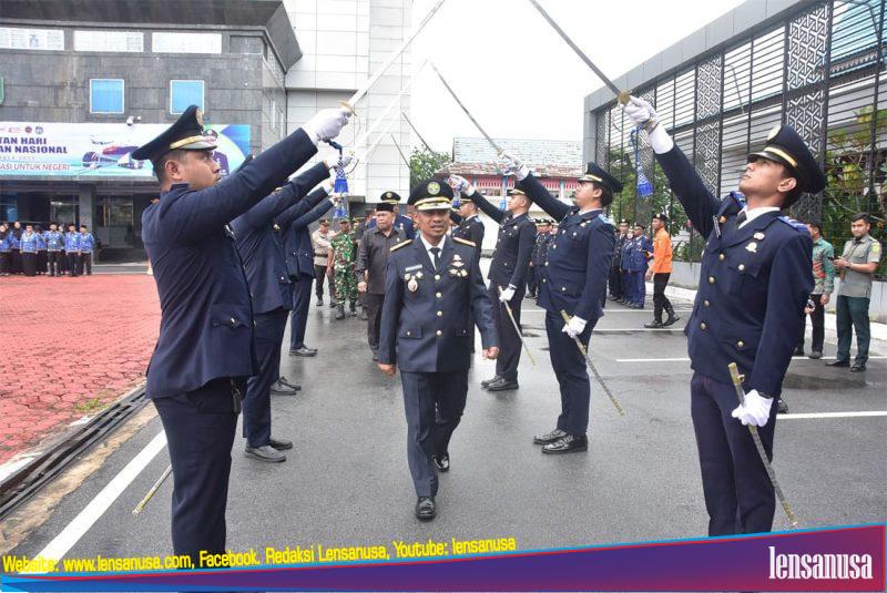 Kedatangan Wakil Bupati H. Bagus Santoso di lapangan upacara disambut dengan prosesi jajar kehormatan pedang pora oleh para taruna perhubungan.