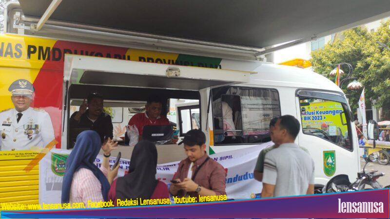 Tampak mobil pelayanan keliling Disdukcapil Rohil di kerumuni masyarakat untuk mendapatkan layanan IKD. Petugas Disdukcapil yakni Administrator Data Base Darsono dan Firdaus serta petugas lainnya juga dengan begitu ramah dan sigap melayani warga baik yang melakukan aktivasi maupun yang sekedar ingin bertanya.