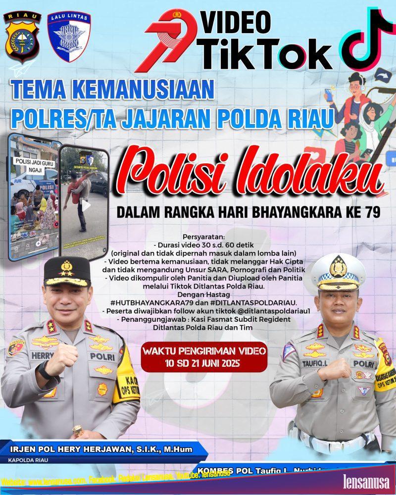 PEKANBARU | LENSANUASA.COM – Dalam rangka memperingati Hari Bhayangkara ke-79, Direktorat Lalu Lintas (Ditlantas) Polda Riau melalui Subdit Regident menyelenggarakan Lomba Video TikTok bertema “Kemanusiaan” yang diikuti oleh seluruh jajaran Polres/Ta se-Polda Riau. Lomba ini mengangkat tajuk “Polisi Idolaku” sebagai bentuk kampanye humanis dari institusi kepolisian kepada masyarakat.