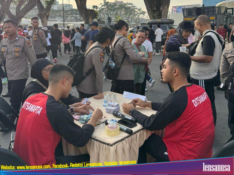 MEDAN | LENSANUSA.COM – Direktorat Samapta (Ditsamapta) Polda Sumatera Utara menghadirkan suasana berbeda pada kegiatan Car Free Day di Lapangan Merdeka Medan, Minggu pagi. Melalui Gerakan Pangan Murah, ratusan personel diterjunkan untuk memberikan pelayanan, hiburan, hingga edukasi kepada masyarakat sejak pukul 05.30 hingga 09.30 WIB.