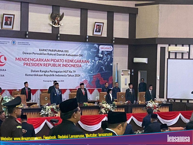 OKI | Lensanusa.com – Dalam rangka peringatan Hari Ulang Tahun (HUT) ke-79 Kemerdekaan Republik Indonesia, Presiden Joko Widodo sampaikan Pidato Kenegaraannya pada Sidang Tahunan MPR RI, Sidang Bersama DPR RI dan DPD RI di Gedung Nusantara, Jakarta. Pada kesempatan tersebut Presiden sampaikan ucapan terima kasih dan permohonan maaf kepada seluruh masyarakat di akhir jabatannya. Pidato tersebut disaksikan secara daring pada Rapat Paripurna XXI DPRD Kabupaten Ogan Komering Ilir (OKI), Jumat (16/08/2024) di Ruang Rapat Paripurna, dibuka oleh Ketua DPRD OKI Abdiyanto Fikri.
