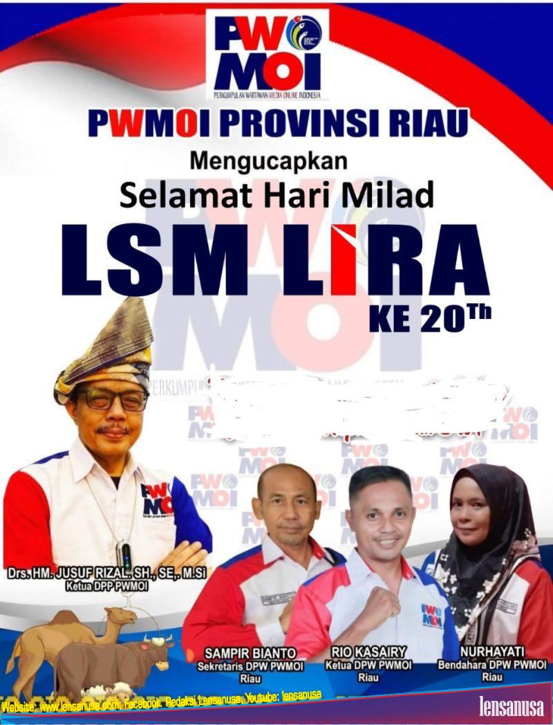 “Kami, dari Dewan Pimpinan Wilayah (DPW) Perkumpulan Wartawan Media Online Indonesia (PWMOI) Provinsi Riau mengucapkan selamat Milad LSM LIRA ke 20, semoga LIRA dapat terus berbuat dan konsisten membela rakyat,” tutup Rio mengakhiri ucapan selamatnya.