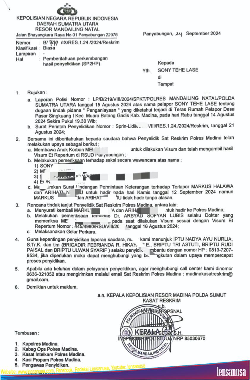 Dalam SP2HP, dijelaskan Polres Madina telah mengeluarkan Surat Perintah Penyelidikan terkait perkara itu pada tanggal 21 Agustus 2024 dan telah memerisa 4 orang saksi Korban.