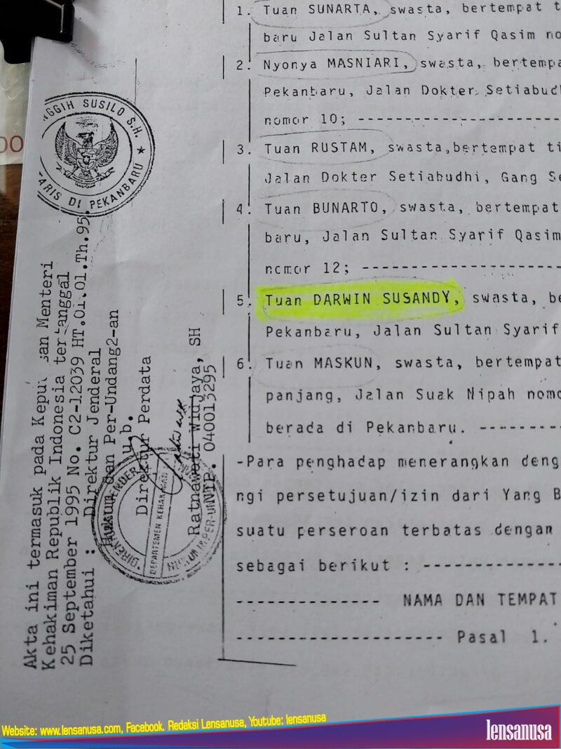 Disebutkan, Darwin susandy di masukkan ke dalam berita Media On-Line karena berdasarkan Akta Notaris. Darwin adalah Direktur Utama PT. SGP dan dulunya pada PT. Siak Seraya juga sebagai Direktur.