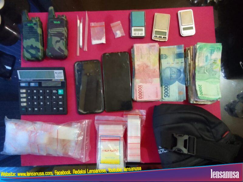 Selanjutnya dilakukan penggerebekan di satu pondok kaca yang ada di lokasi. Disitu didapati dua orang pria inisial SS dan AR. Saat dilakukan penggeledahan ditemukan sejumlah barang bukti yakni , 2 bungkus plastik klip tembus pandang diduga berisikan narkotika jenis sabu seberat 1.75 gram bruto, uang hasil penjualan sabu-sabu Rp 1.544.000, 2 unit HT warna hijau loreng, 3 sekop terbuat dari pipet, 1 unit kalkulator, 3 unit timbangan, 1 buku catatan, uang dalam dompet hitam Rp 300.000, uang dalam tas hitam Rp 315.000, 2 unit handphone android Merek Oppo dan Samsung.