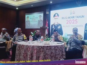 YOGYAKARTA | LENSANUSA.COM. – Kepolisian Daerah Daerah Istimewa Yogyakarta ( Polda DIY) menggelar Konferensi Pers Akhir Tahun 2025 sebagai bentuk pertanggungjawaban publik atas kinerja Polri sepanjang tahun. Kegiatan ini menjadi momentum refleksi sekaligus penguatan komitmen Polda DIY dalam menjaga stabilitas keamanan, menegakkan hukum, serta hadir di tengah masyarakat sebagai penggerak kesejahteraan dan pembangunan daerah. Kegiatan ini berlangsung di Ballroom Tanjungsari Hotel Merapi Merbabu Seturan Depok Sleman ,Selasa (30/12/2025).