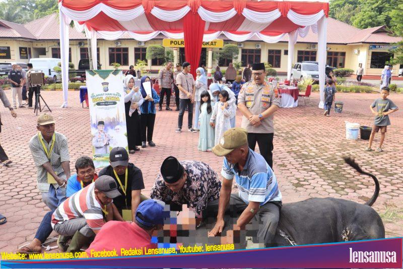LANGKAT | LENSANUSA.COM – Dalam semangat berbagi di Hari Raya Idul Adha 1446 Hijriah/2025 Masehi, Kapolres Langkat, AKBP David Triyo Prasojo, SH, SIK, MSi., menyerahkan 12 ekor sapi dan 5 ekor Kambing kurban kepada panitia pemotongan hewan kurban Polres Langkat, Penyerahan dilakukan di halaman Mapolres Langkat dan langsung dilakukan pemotongan hewan Kurban oleh Panitia, Jumat 6 Juni 2025 pagi.