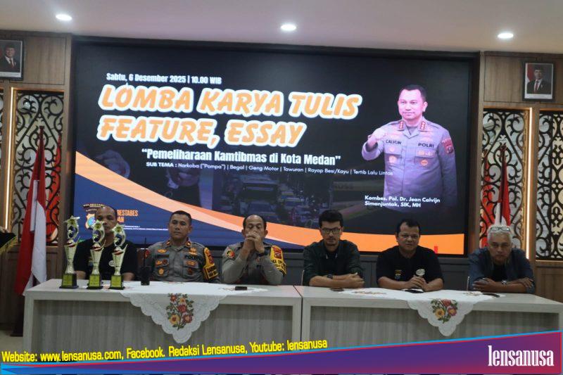 MEDAN | LENSANUSA.COM – Dalam rangka mengoptimalkan peran media dalam menciptakan opini publik yang sehat terkait keamanan masyarakat, Kapolrestabes Medan Kombes Pol Dr. Jean Calvijn Simanjuntak, S.I.K., M.H menggelar Kapolrestabes Medan Cup – Lomba Karya Tulis Jurnalistik di Aula Patriatama Polrestabes Medan, Sabtu (6/12/2025). Kegiatan berlangsung mulai pukul 10.00 hingga 19.00 WIB dan diikuti puluhan wartawan dari berbagai media cetak maupun online.