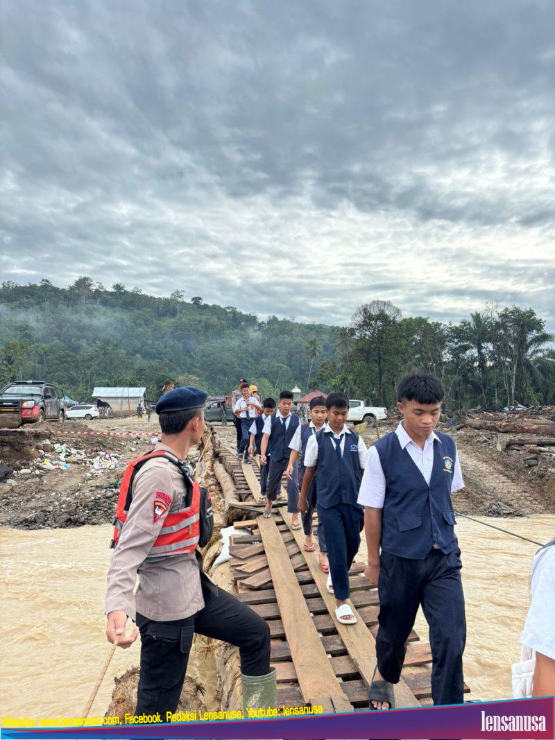 Di tengah kondisi infrastruktur yang belum sepenuhnya pulih, personel Brimob tidak hanya menyediakan sarana transportasi, tetapi juga dengan sigap membantu siswa-siswi menyeberangi jembatan sementara yang dibangun pascabanjir bandang. Langkah ini dilakukan demi memastikan anak-anak tetap dapat mengikuti kegiatan belajar mengajar dengan aman dan tepat waktu.