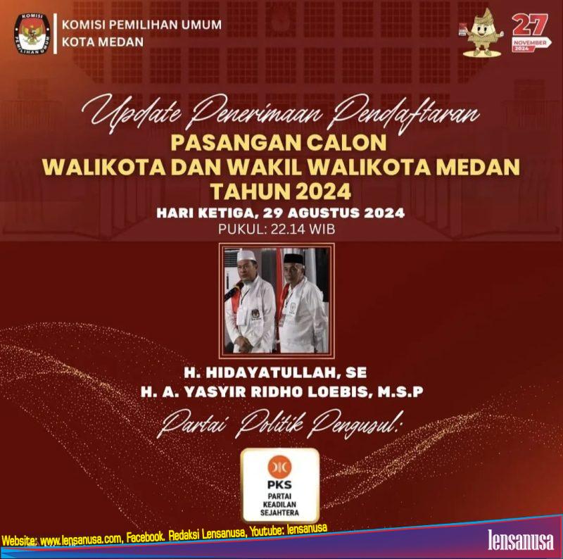 Adapun Pasangan Calon dari PKS tersebut yakni Hidayatullah-Yasir Ridho Lubis dalam Pemilihan Walikota dan Wakil Walikota Medan 2024.