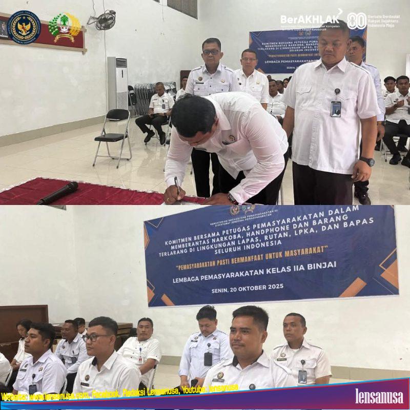 BINJAI | LENSANUSA.COM – Lembaga Pemasyarakatan (Lapas) Kelas IIA Binjai memperkuat komitmen anti-narkoba, handphone ilegal, dan barang terlarang lainnya. Kepala Lapas Binjai, Wawan Irawan, bersama seluruh jajaran, mengikuti kegiatan Penandatanganan Komitmen Bersama yang dilaksanakan secara nasional dan serentak secara daring pada Senin (20/10/2025) pukul 14.00 WIB.