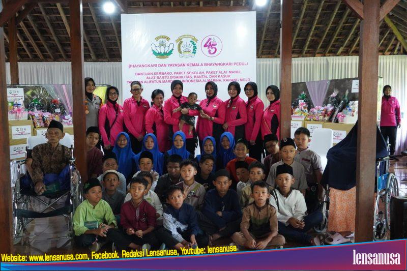 Dalam kunjungan tersebut, Wakil Ketua Umum Bhayangkari menyerahkan bantuan sosial berupa paket sembako, paket perlengkapan sekolah, kursi roda, susu formula dan perlengkapan kebutuhan sehari-hari kepada Pengurus Yayasan Al-Marina.