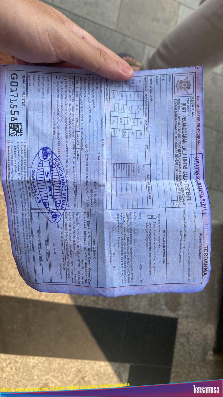 LENSANUSA.COM |MEDAN,–- Pengendara sepeda motor bernama Vanes Tanzola diduga dipaksa harus membayar pajak STNK kendaraan setelah ditilang oknum personel Satlantas Polrestabes Medan di Jalan Pandu, Medan.