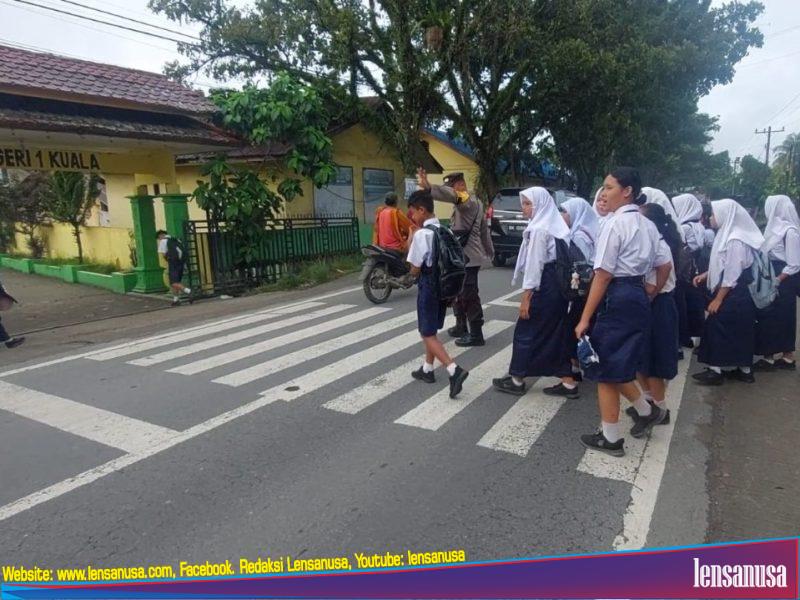 Peduli Keselamatan Siswa, Bhabinkamtibmas Polsek Kuala Turun Langsung Atur Lalu Lintas Pagi Hari
