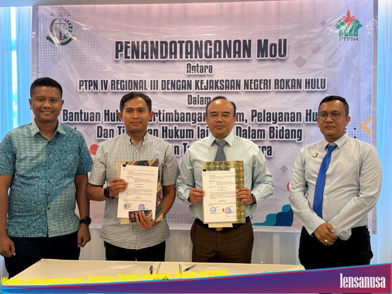 ROKAN HULU | LENSANUSA.COM – Rabu tanggal 30 April 2025 Kejaksaan Negeri Rokan Hulu didampingi dengan Kasi Perdata dan Tata Usaha Negara dan Jaksa Pengacara Negara (JPN) melakukan penandatanganan Memorandum of Understanding (MOU) dengan PTPN IV Regional III di bidang Tata Usaha Negara.