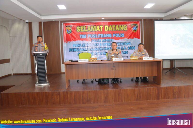 Polresta Bandar Lampung menerima kunjungan Tim Puslitbang Polri, dalam rangka penelitian dan supervisi tentang Pemulihan Ekonomi Nasional Tahun Anggaran 2024, bertempat di Aula Wira Satya Polresta Bandar Lampung, Senin (01/04/2024) pagi.
