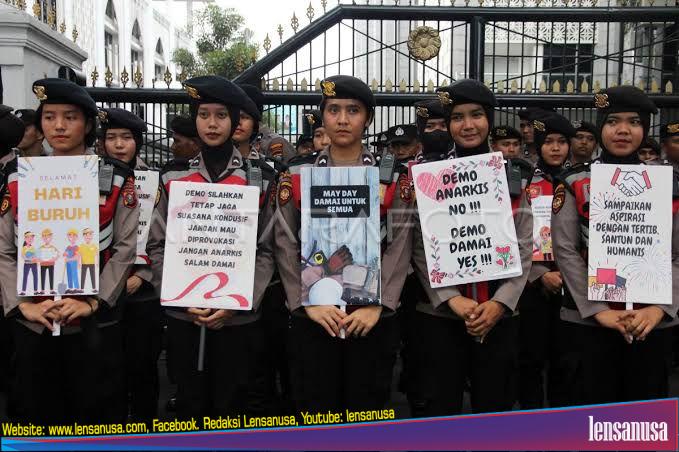 Sejumlah personel Polisi Wanita (Polwan) tampak berjaga sambil memegang poster kecil berisi ucapan selamat Hari Buruh 2025, sebagai simbol penghormatan dan empati terhadap perjuangan para pekerja.