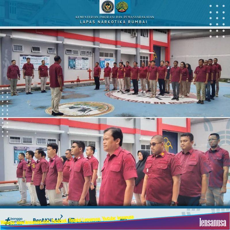 LENSANUSA.COM | PEKANBARU – Pelaksanaan apel pagi adalah kegiatan yang wajib dilaksanakan oleh pegawai Lapas Narkotika Rumbai. Tujuannya dilaksanakan apel pagi yaitu untuk mendengar arahan dan informasi dari pimpinan, untuk melatih kedisiplinan dan tanggungjawab sebagai ASN, serta mengetahui informasi perkembangan situasi terkini.