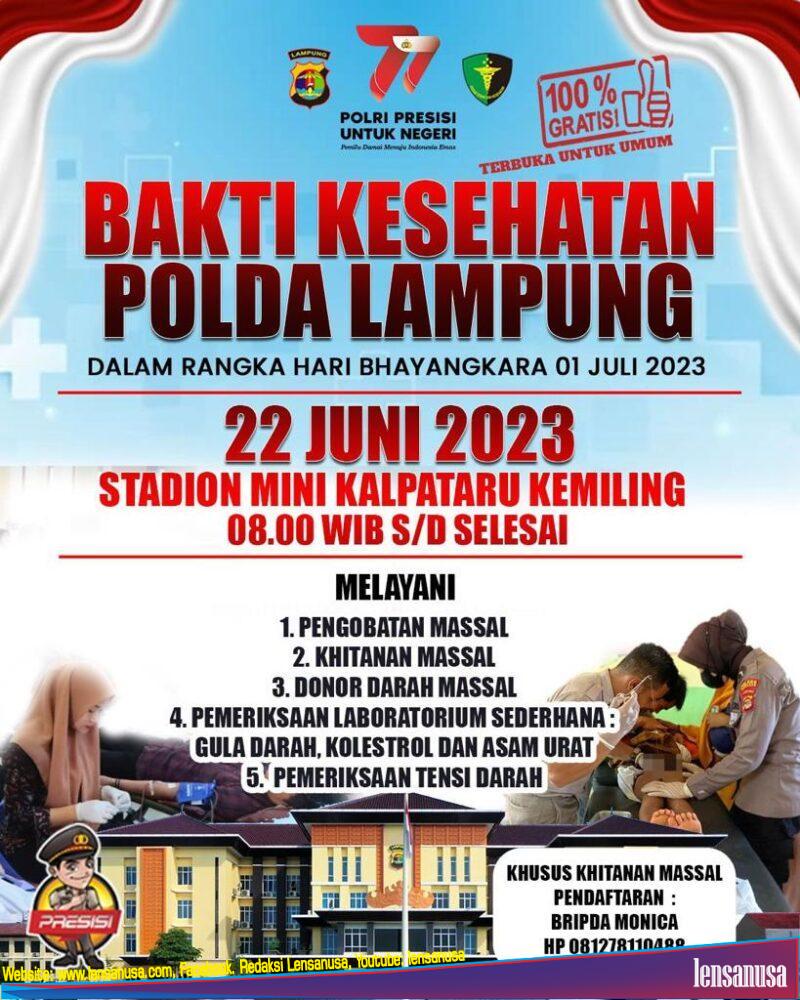 LAMPUNG | LENSANUSA.COM – Dalam rangka menyambut Hari Bhayangkara ke-77 Polda Lampung akan menggelar bakti kesehatan yang akan dilaksanakan pada 22 Juni 2023, bertempat di stadion mini kalpataru kemiling Bandar lampung, Rabu (14/06/2023).