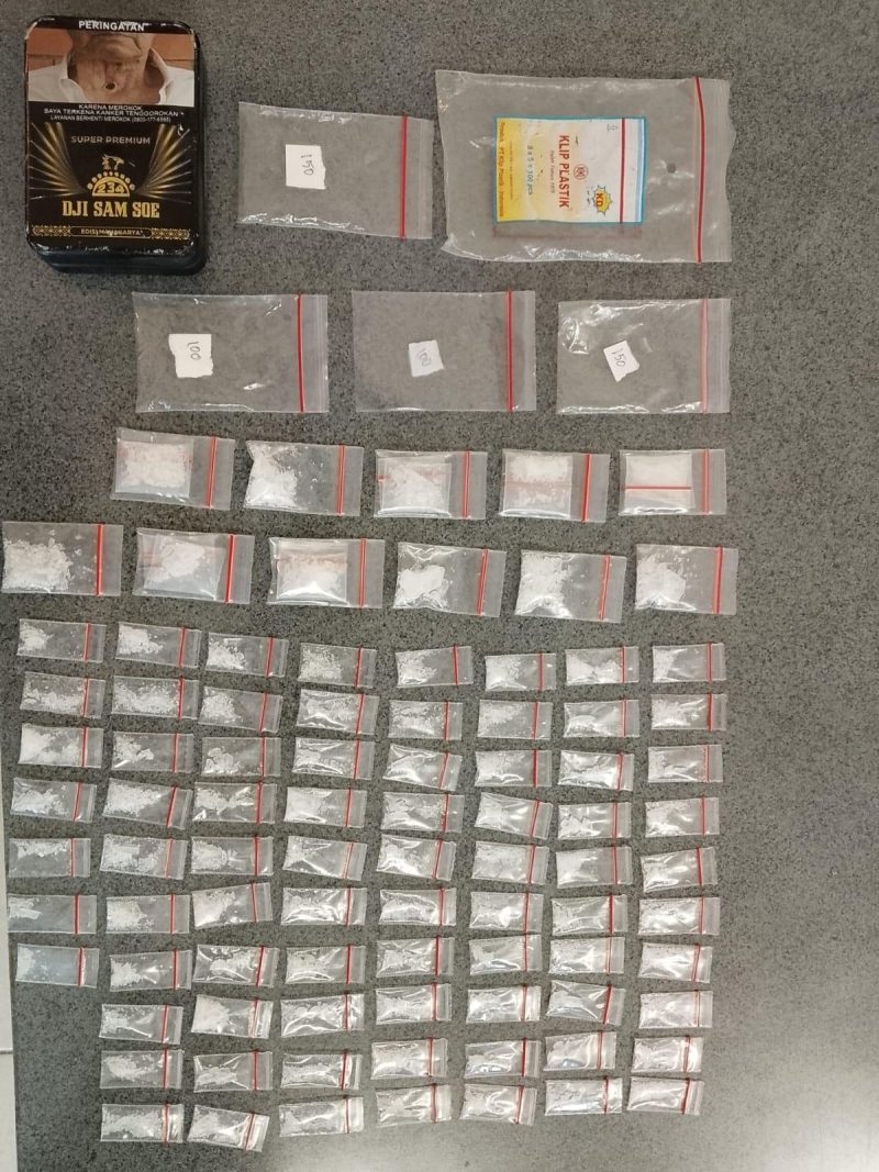 Selain itu, turut diamankan sejumlah barang bukti lainnya berupa lima plastik klip kosong, satu kotak rokok kaleng warna hitam, serta satu unit telepon seluler yang diduga digunakan untuk aktivitas transaksi.