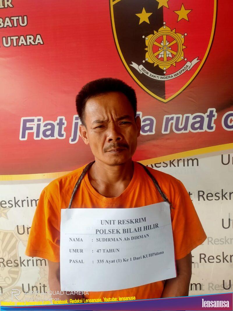LABUHANBATU|LENSANUSA.COM- Sudirman alias Dirman (47) diamankan Tim Opsnal Polsek Bilah Hilir Polres Labuhanbatu atas dugaan tindak pidana pengancaman terhadap Bambang Wiyono Warga Dusun Sei Kasih Dalam II Desa Sei Kasih Kecamatan Bilah Hilir Kabupaten Labuhanbatu, Senin (23/10/2023).