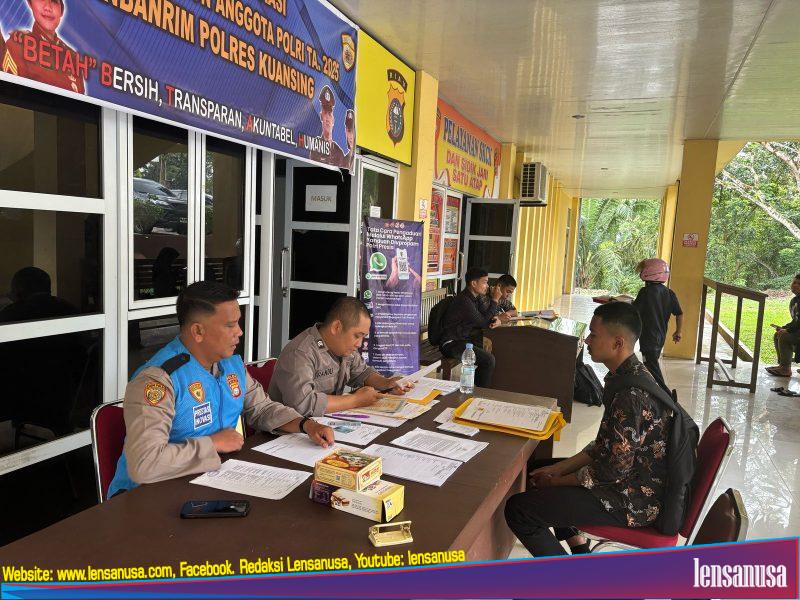 Dalam proses rekrutmen ini, animo pendaftar yang mengikuti seleksi di Polres Kuansing mencapai 181 orang, terdiri dari 155 pendaftar pria dan 26 pendaftar wanita. Rinciannya adalah sebagai berikut Akpol: 6 orang (5 pria, 1 wanita), Bintara PTU: 132 orang (111 pria, 21 wanita), Bintara Polair: 1 orang (1 pria), Bintara Brimob: 28 orang (28 pria), Bintara Kompetensi Khusus (Bakomsus) Tata Boga: 0 orang, Gizi: 1 orang (0 pria, 1 wanita), Hukum: 0 orang, Akuntansi: 0 orang, Tenaga Kesehatan (Nakes): 4 orang (2 pria, 2 wanita) dan Tamtama: 6 orang (6 pria)