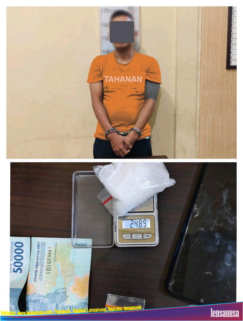 Dalam penggeledahan badan dan rumah HS, petugas menemukan Satu Buah Plastik Klip Bening Di Duga Berisikan Narkotika Sabu dengan berat Bruto 24,95 gram, HS mengakui bahwa barang bukti tersebut adalah miliknya. Selain itu, petugas juga menyita 8 (Delapan) Buah Plastik Bening kosong, 1 (satu) Unit Timbangan Elektrik, 1(Satu) Unit HP Merk VIVO Warna Biru, dan Uang Tunai 3(Tiga) lembar pecahan 50.000 Rp 150.000,00 (Seratus Lima Puluh Ribu Rupiah.