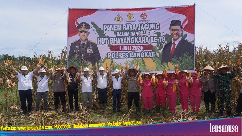 LANGKAT | LENSANUSA.COM – Dalam rangka menyambut Hari Bhayangkara ke-79, Polres Langkat menunjukkan kepedulian dan dukungan nyata terhadap ketahanan pangan nasional dengan menggelar kegiatan Panen Raya Jagung di lahan milik PT. LNK, Perkebunan Tanjung Beringin, Kabupaten Langkat, Rabu (18/6/25).