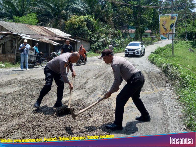 LANGKAT | LENSANUSA.COM – Kapolsek Bahorok AKP Tunggul Situmeang, S.H, bersama personilnya melakulan penimbunan jalan yang rusak untuk menghindari terjadinya kecelakaan lalulintas dan pungli dijalanan.