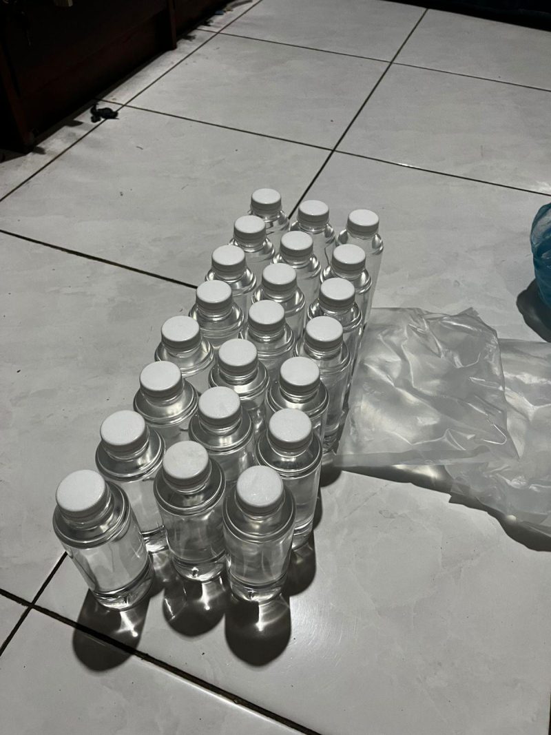 61 botol kosong beserta tutupnya yang siap digunakan untuk mengemas oplosan.
