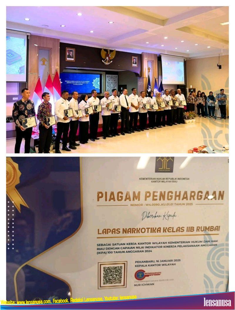 PEKANBARU- LENSANUSA.COM-Lembaga Pemasyarakatan (Lapas) Narkotika Kelas IIB Rumbai meraih penghargaan dengan nilai Sempurna (100) Indeks Kinerja Pelaksanaan Anggaran (IKPA) dari Kantor Wilayah Kementerian Hukum dan HAM Riau atas Evaluasi Capaian Kinerja Tahun Anggaran 2024. Lapas Narkotika Kelas IIB Rumbai menerima penghargaan tersebut secara langsung di Aula Ismail Saleh, Selasa (21/1/2025).