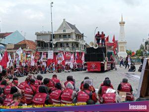 YOGYAKARTA | LENSANUSA.COM. – Dalam memperingati hari buruh internasional (May Day) ribuan massa dari berbagai organisasi buruh seperti Serikat Buruh Sejahtera Indonesia (SBSI) Forum Komunikasi Buruh Bersatu (FKBB) ,Serikat Pekerja Seluruh Indonesia (SPSI) dan juga Federasi Serbuk Indonesia menggelar aksi di titik Nol Yogyakarta, Kamis (1/5/2025).