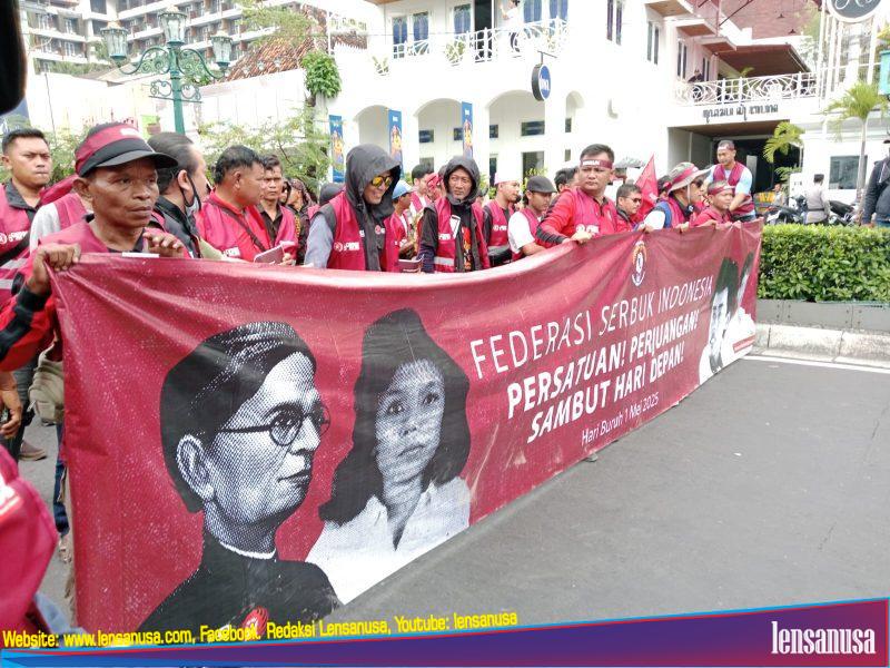 YOGYAKARTA | LENSANUSA.COM. – Dalam memperingati hari buruh internasional (May Day) ribuan massa dari berbagai organisasi buruh seperti Serikat Buruh Sejahtera Indonesia (SBSI) Forum Komunikasi Buruh Bersatu (FKBB) ,Serikat Pekerja Seluruh Indonesia (SPSI) dan juga Federasi Serbuk Indonesia menggelar aksi di titik Nol Yogyakarta, Kamis (1/5/2025).