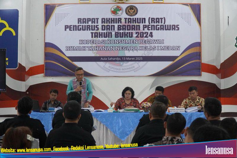 MEDAN | LENSANUSA.COM – Koperasi Pegawai Rutan Kelas I Medan menggelar Rapat Anggota Tahunan (RAT) yang berlangsung pada Kamis (13/3) di Aula Sahardjo. Rapat ini dihadiri oleh Kepala Rutan I Medan, Andi Surya, pejabat struktural, seluruh anggota koperasi Rutan medan dan perwakilan dari Dinas Koperasi Kota Medan. Kepala Rutan I Medan yang juga berperan sebagai pembina koperasi, dalam sambutannya menyampaikan ucapan terima kasih dan apresiasi kepada pengurus koperasi. Ia juga menekankan pentingnya menjunjung tinggi asas kebersamaan dalam setiap kegiatan koperasi.