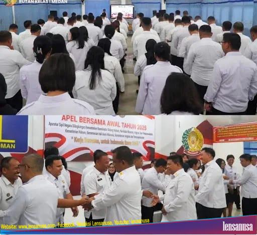 MEDAN | LENSANUSA.COM – Masih dalam suasana semangat menyambut tahun baru, Rutan Kelas I Medan mengikuti Apel Bersama Awal Tahun 2025 secara virtual melalui zoom yang digelar oleh Kementerian Koordinator Bidang Hukum, Hak Asasi Manusia, Imigrasi dan Pemasyarakatan dan dihadiri oleh seluruh Aparatur Sipil Negara (ASN) di lingkungan Kementerian tersebut.
