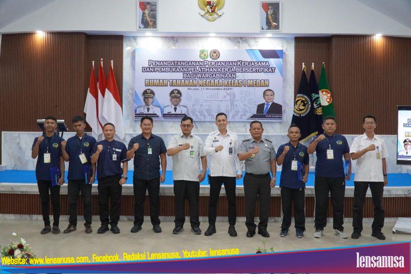 MEDAN | LENSANUSA.COM – Rumah Tahanan Negara (Rutan) Kelas I Medan resmi menjalin kerja sama strategis dengan Dinas Ketenagakerjaan (Disnaker) Pemerintah Kota Medan serta empat Lembaga Bantuan Hukum (LBH) melalui kegiatan Penandatanganan Perjanjian Kerja Sama dan Pembukaan Pelatihan Kerja Bersertifikat bagi warga binaan yang digelar pada Selasa, (11/11/2025). Kolaborasi ini merupakan langkah nyata Rutan Medan dalam meningkatkan kualitas layanan pembinaan serta pemenuhan hak-hak warga binaan.