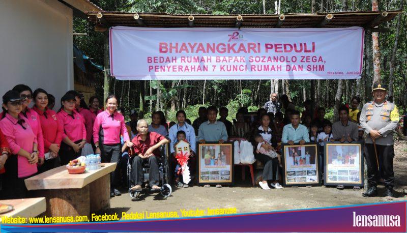 Ketua Pengurus Daerah Bhayangkari Sumut, Ny. Ernie Agung Setya pada sambutan Singkatnya pada saat penyerahan Kunci rumah serta SHM Kepada Keluarga Sozanolo Zega, mengatakan Bahwa Kegiatan Bedah Rumah dan Gereja, Bhakti Kesehatan, Bhakti Sosial yang di Laksanakan di Kab. Nias Utara adalah Inisiatif Ketua Umum Bhayangkari Ny. Juliati Sigit Prabowo, Sebagai Rangkaian Kegiatan dalam Rangka Menyambuat Hari Kesatuan Gerak Bhayangkari (HKGB) ke. 72 tahun 2024 pada Bulan Oktober yang akan datang. “