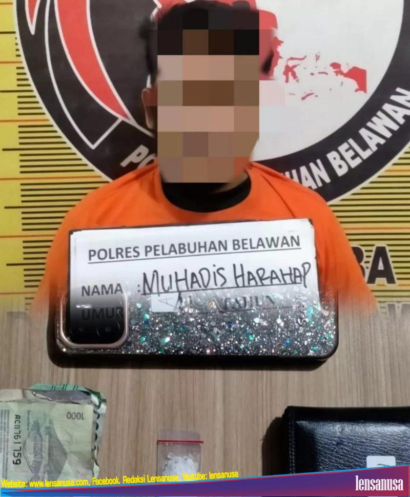 Tersangka berinisial Muhadis (41)ditangkap bersama 1 plastik klip berisi shabu, sebuah dompet, satu unit telepon genggam, dan uang tunai Rp 50.000 yang diduga hasil transaksi.