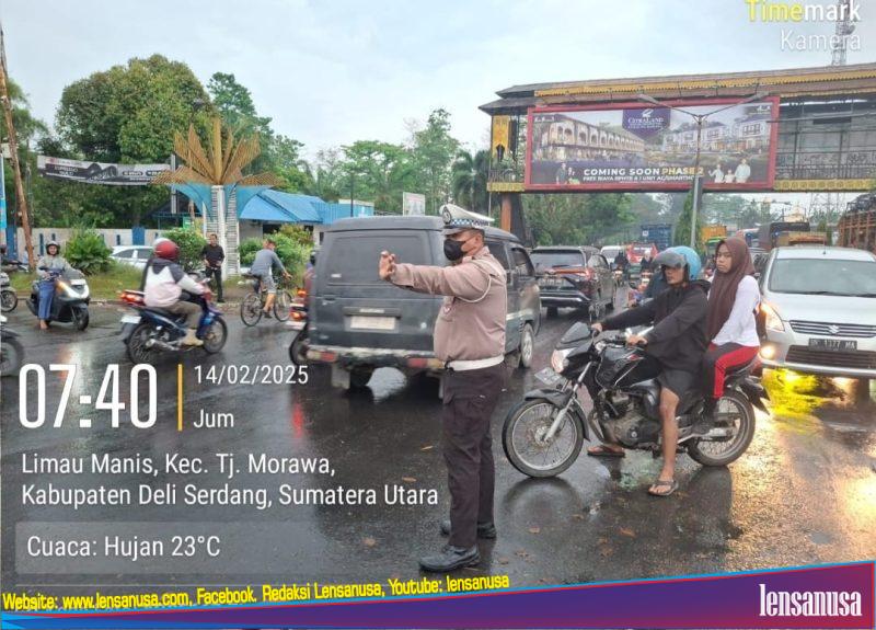 DELI SERDANG | LENSANUSA.COM – Satuan Lalu Lintas (Sat Lantas) Polresta Deli Serdang, melakukan pengaturan lalu lintas di Jalan Lintas Medan – Lubuk Pakam. Jumat (14/02/25)